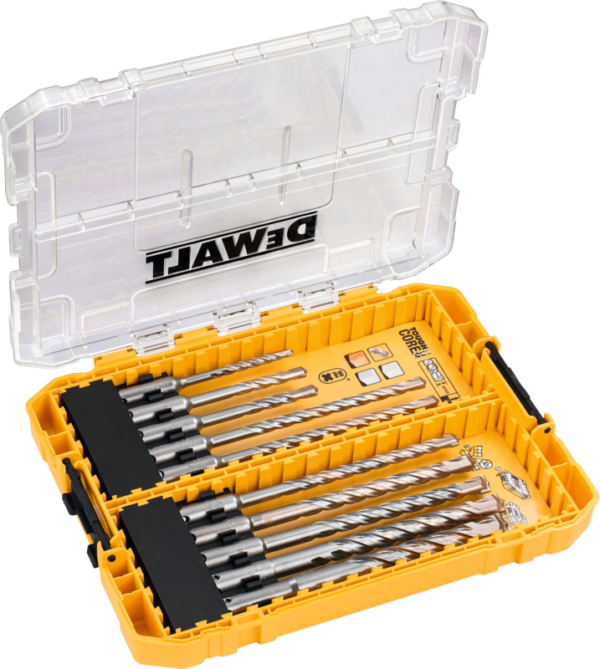 Boor gemakkelijk gaten in beton met de DeWalt 10-delige Extreme 2 SDS-Plus Boren Set Tough Case. De boren hebben een doorsnede tussen de 5 en 12 millimeter en zijn 110 of 160 millimeter lang. Je klikt ze gemakkelijk vast op een SDS plus boorkop. Ook krijg je een handige DeWalt Tough Case. Heb je 2 of meer Tough Cases? Dan stapel je deze op elkaar, zodat je al jouw boren gemakkelijk meeneemt.