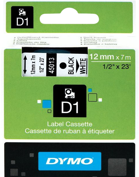 Met de DYMO Authentieke D1 labels Zwart-Wit (12 mm x 7 m) label je thuis en op kantoor jouw spullen. De labels hechten aan de meest schone, vlakke oppervlakken zoals plastic, papier, metaal, hout en glas. De print is thermisch, dus geen gedoe met inkt of toner. De achterkant is makkelijk verwijderbaar door de Easy Peel¿ techniek en mocht het hele label overbodig zijn geworden, dan verwijder je deze zonder achterlating van lijmrestjes. De DYMO D1 Naamlabels zijn geschikt voor de Dymo Labelmanager en de Dymo MobileLabeler.