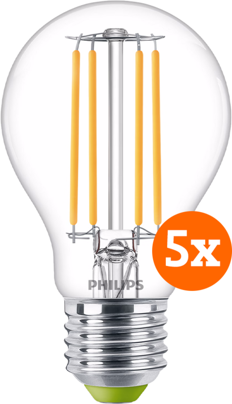Met het Philips led E27 lampen 5-pack uit de Groene lijn van Philips kies je voor Philips’ meest energiezuinige ledlamp ooit, zonder in te leveren op lichtkwaliteit. Dankzij de zichtbare filamentdraden lijkt de ledlamp op een ouderwetse gloeilamp. Toch verbruikt hij maar 2,3 Watt. De lichtkleur is warm wit, wat zich vertaald in 3000 K. De lamp is direct op zijn volledige lichtsterkte van 485 lumen. Dit is vergelijkbaar met een gloeilamp van 40W. Deze Philips led lamp heeft een grote E27 fitting.