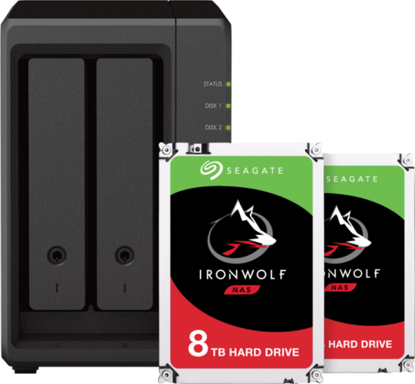 Creëer een krachtige server en opslagruimte met de Synology DS723+ + Seagate Ironwolf 16TB (2x8TB). Deze bundel bevat 2 Seagate IronWolf interne harde schijven, van ieder 8 terabyte. Zo heb je in totaal 16 terabyte aan opslag tot je beschikking, die je op verschillende manieren instelt in de NAS. Je plaatst de 2 harde schijven in de NAS en gaat meteen aan de slag met overzetten of het maken van back-ups in JBOD, RAID-0 of RAID-1. De Synology DS723+ is geschikt voor gebruik met meer dan 10 personen tegelijkertijd. De AMD Ryzen R1600 dualcore processor heeft een turbosnelheid van 3,1 gigahertz, waardoor alle commando’s vloeiend verlopen. Door het 4 gigabyte RAM geheugen ervaar je weinig tot geen vertragingen tijdens het werken. Wil je wat extra geheugen? Door het 2 gigabyte RAM geheugen ervaar je weinig vertragingen tijdens het werken. Wil je wat extra geheugen? De DS723+ ondersteunt tot 32 gigabyte aan DDR4 RAM geheugen, verspreid over 2 sloten, voor een extra boost. Net zoals bij alle Synology NAS modellen maak je ook bij de DS723+ gebruik van Synology Drive Server en bewerk je de opslagruimte van de NAS vanaf ieder aangesloten apparaat. De Seagate IronWolf schijven hebben een gemiddelde rotatiesnelheid van 5900 RPM. Hierdoor laad je bestanden extra snel vanaf de schijf, zonder haperingen. Daarnaast zorgt het 256 gigabyte cachegeheugen ervoor dat je veelgebruikte bestanden snel opent. Je hebt met deze combinatie direct 16 terabyte aan opslag. Dit is genoeg voor zo’n 1.600 full hd films of 200.000 uur aan muziek. Dit product is inclusief Seagate Rescue Services voor 3 jaar gegevensherstel.